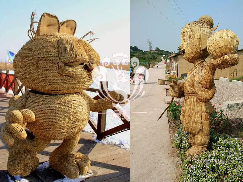 現在的精致稻草人藝術通常是由專業美術老師的造型放樣,然后由焊工師傅焊接出立體造型造型,然后以稻草或者稻草繩為材料編捆制作而成。