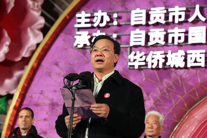 市委書記李剛在開幕式上發表了熱情洋溢的致辭。他說,燈會已成為我們這座城市最靚麗的名片。今年的燈會,還有一個鮮明的特色,就是全球聯動。今晚,自貢燈會將在北京、上海、天津、重慶、深圳、成都、西安、武漢、昆明、宜賓、廣元11座城市同時點亮;而美國、英國、法國、新加坡、比利時等國家,也正舉辦著一場場熱鬧喜慶的自貢燈會。自貢向全國、全世界人民送上了真誠祝福。燈會搭建起開放合作的交流平臺,讓新老朋友走進自貢、關注自貢、了解自貢。李剛書記熱情歡迎海內外朋友共同分享自貢發展機遇,攜手共創更加美好未來。